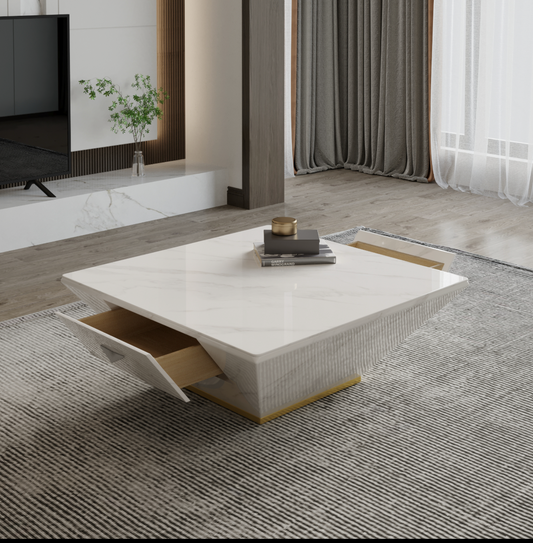 Luxury White Marble Coffee Table – Square Drum Trapezoid Design for Modern Living Rooms