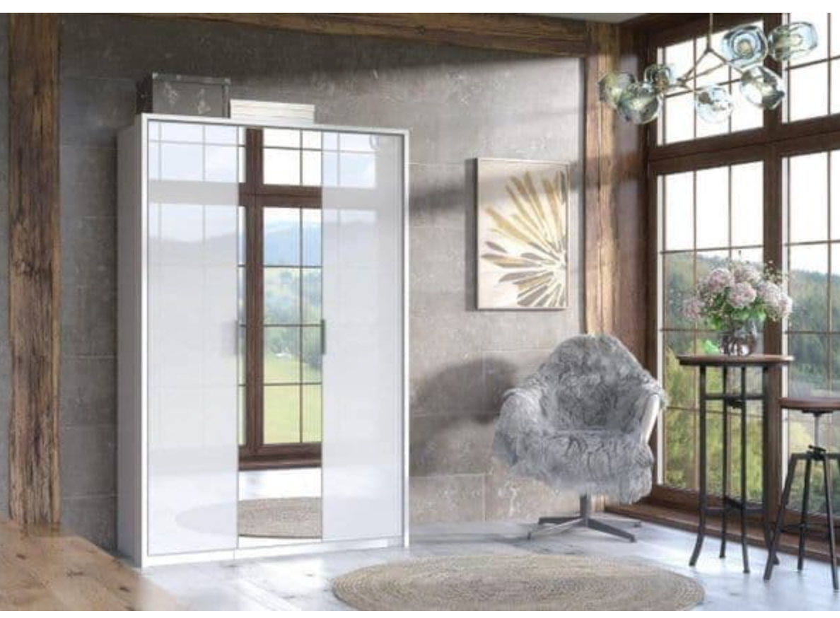 Transform your bedroom with the Rado 3 Door Wardrobe in white high gloss. This elegant piece features three doors, including one mirrored door, providing both style and functionality. Inside, you'll find ample storage with shelves and a hanging rail, perfect for organizing your clothing and accessories.
