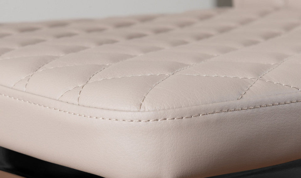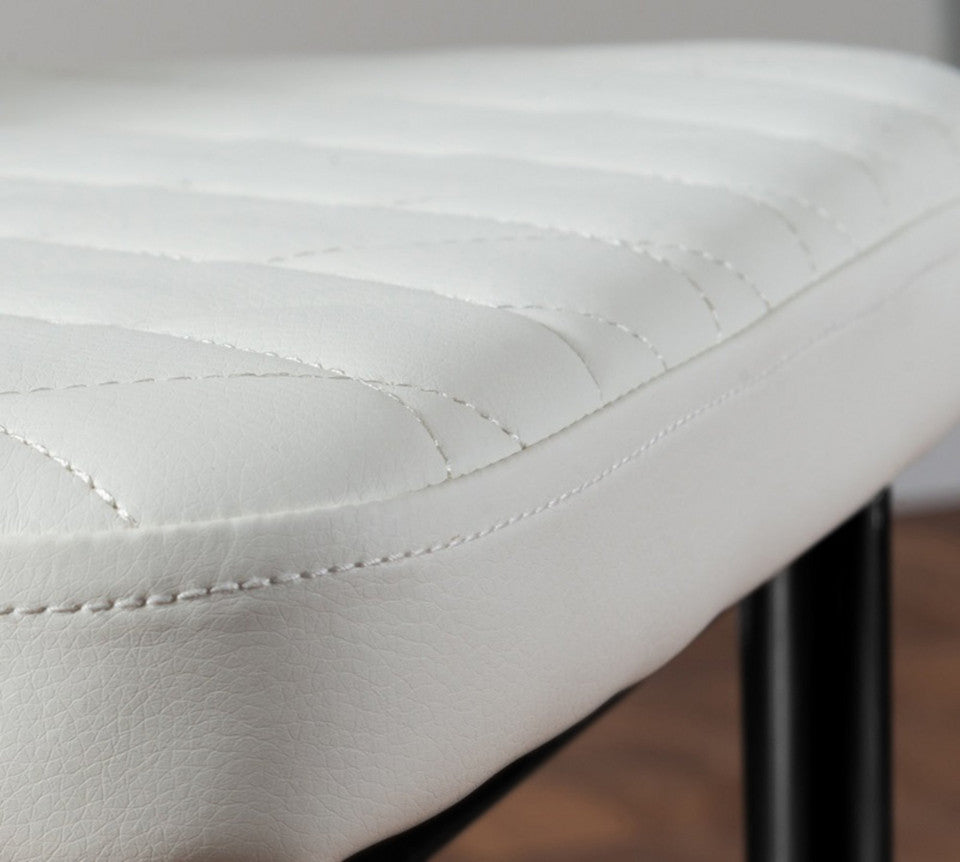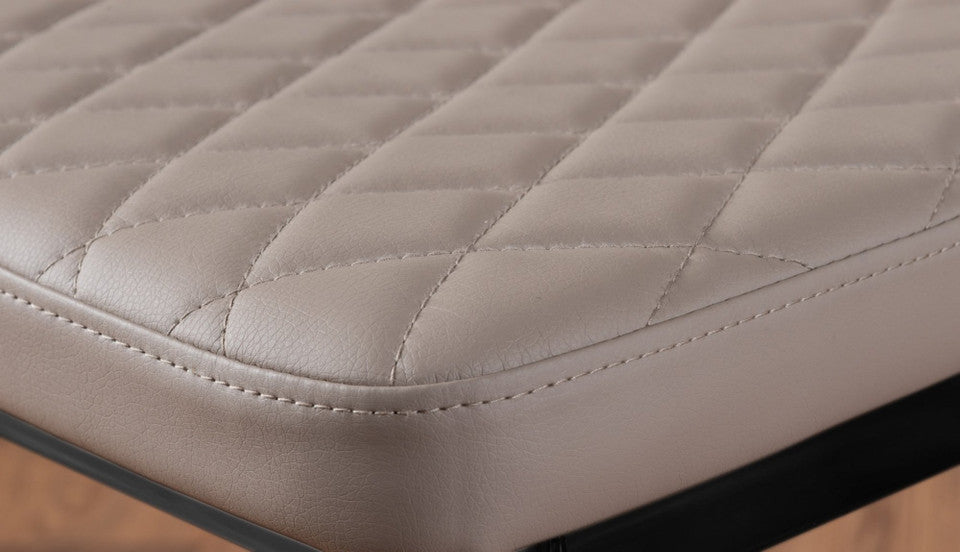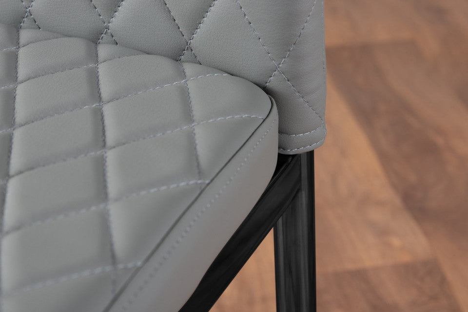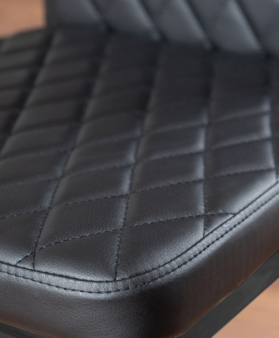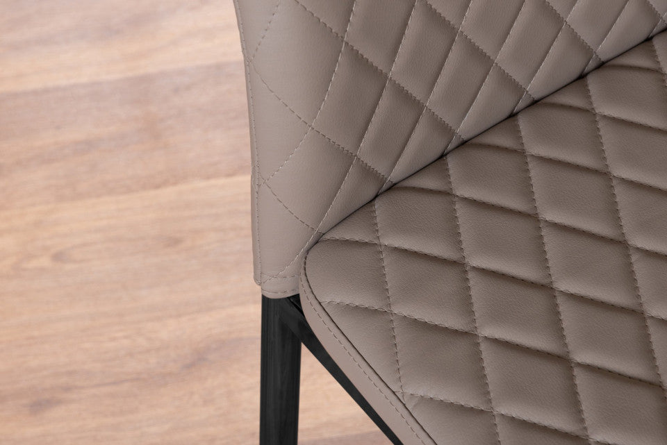 Paired with the table, the Milan dining chairs deliver modern elegance and exceptional comfort. Upholstered in high-quality faux leather with stylish diamond quilting, these chairs offer a refined contemporary look. Ergonomically designed to support your back during extended dining, they feature sleek black powder-coated legs for strength and stability. Protective plastic feet help prevent floor damage, making them ideal for everyday use.