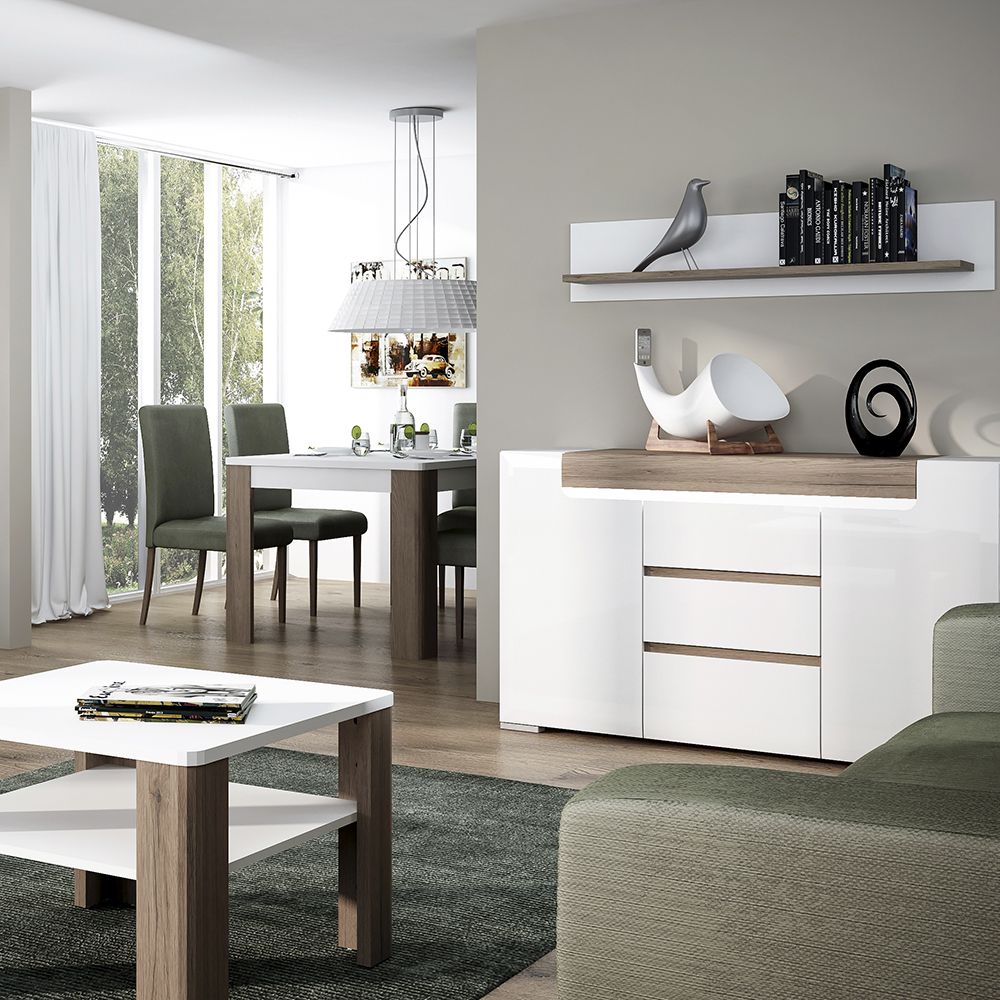 Finished in a sophisticated combination of gloss white and San Remo Oak, the shelf offers a contemporary contrast that adds warmth and elegance to modern interiors. Its clean, minimalist lines allow it to blend seamlessly with a variety of décor styles while complementing other pieces from the Toronto range.