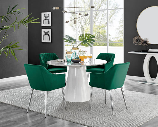 Palma White Marble Effect Round Dining Table & 4 Calla Silver Leg Chairs