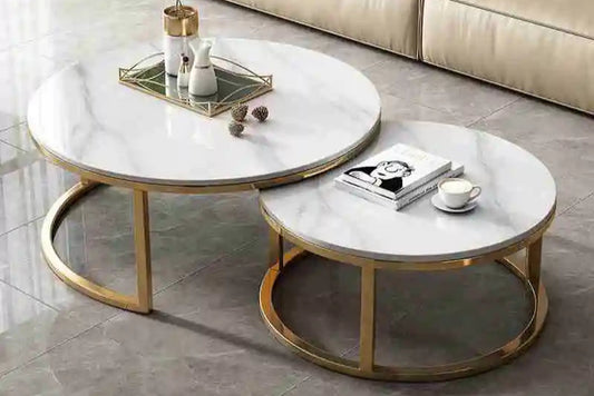 Nestable Coffee Table Set – High Gloss Marble Finish with Gold Accents (Set of 2)