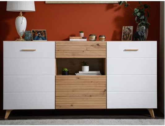 Bretanova Slatted Artisan Oak Effect And White Gloss Sideboard