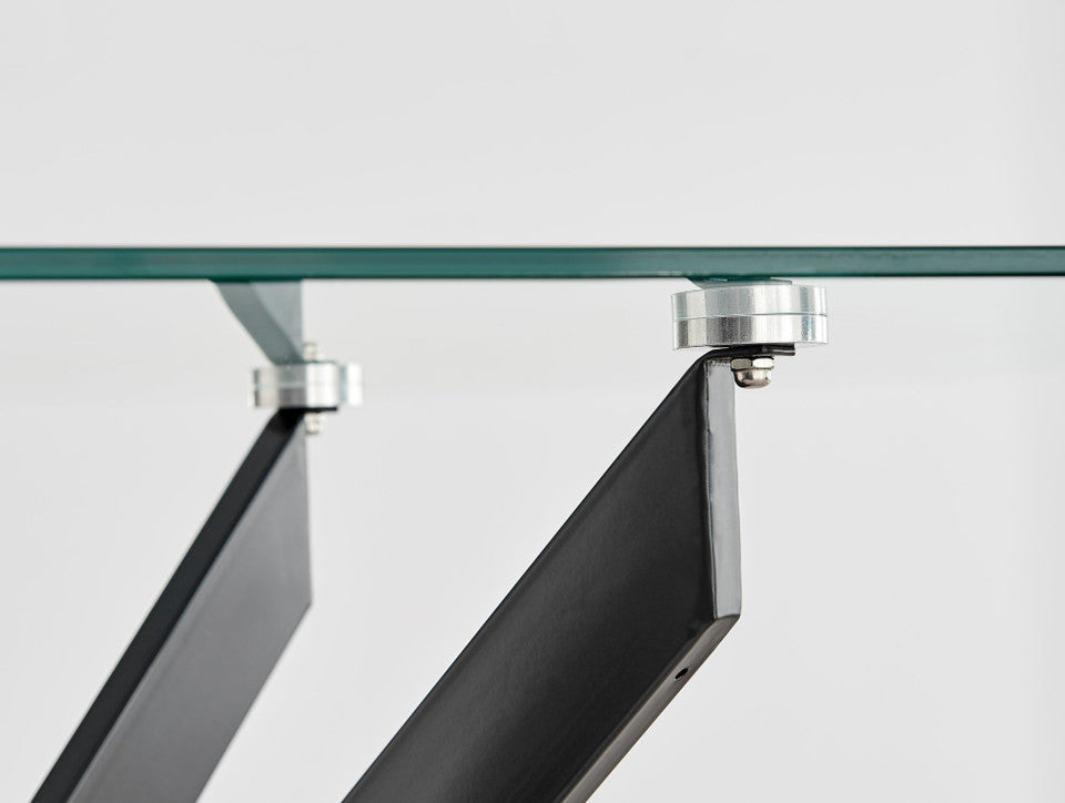 The Leonardo dining table features a 120 x 70cm hardened tempered glass top, offering generous space for up to 4 guests while maintaining a light, open feel. The intertwined sleek black metal legs form a stylish nest-shaped base, creating a striking visual statement while ensuring excellent stability. Crafted with a high-quality finish and durable materials, this table is designed to resist everyday wear while staying effortlessly stylish.